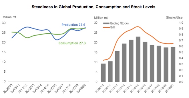 Thatrecord-breaking number still won’t be enough to keep global ending stocks fromrising by the end of the 2019/20, however. Total production is projected toreach 27.6 million tonnes, a number boosted in part by a 6% increase in globalyields, which should leave 17.7 million tonnes in the world’s warehouses at theend of next season.