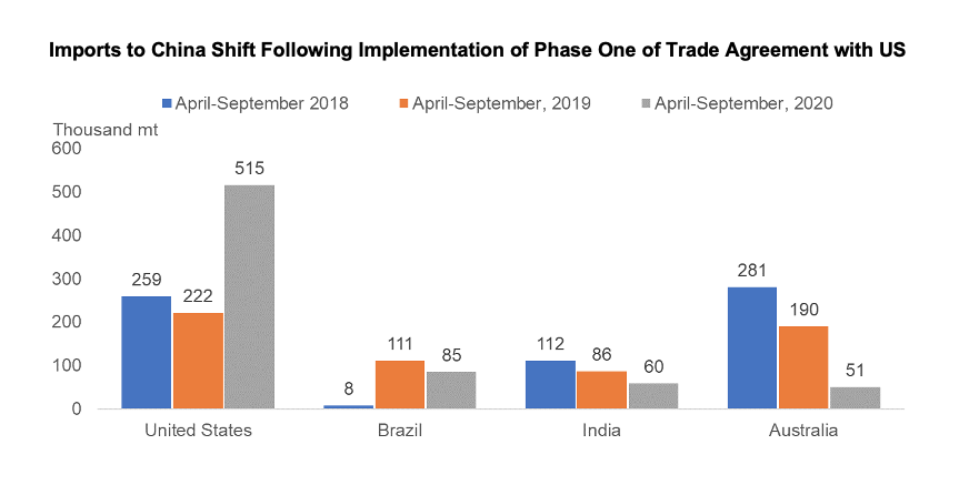 The USA and China are still engaged in a trade war, although the phase-one trade deal is mitigating tensions somewhat. Under the current terms of the agreement, China would purchase record levels of US agricultural products. From the April to September period, China has imported 65% more cotton from the United States over the preceding period. With Phase One of the trade agreement going into effect on 20 February 2020, the increase in imports was anticipated to be seen in April given the time to react and shipments to be received by China customs.